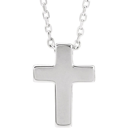 Petite smooth cross necklace is made of polished 14k white gold. Cross length: 1/2in. 14k white gold diamond-cut cable chain is adjustable in length from 16 to 18 inches. Weighs 2.6 grams. Please note: weight is approximate, actual weight may vary.