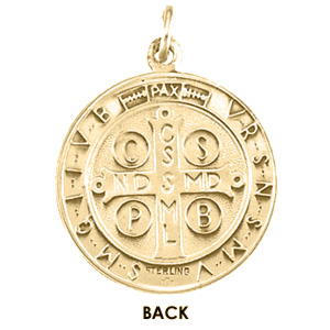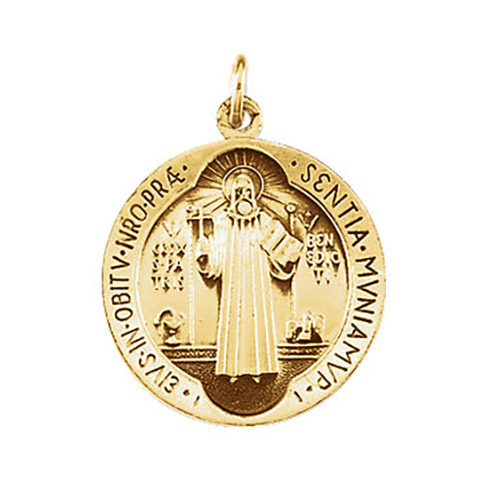 This round Saint Benedict medal is made of polished 14kt yellow gold. St. Benedict is the patron saint of monks and missions. Dimensions: 18mm diameter. This item is the size of a dime. Weighs 2.88 grams. Please note: weight is approximate, actual weight may vary. Chain not included.