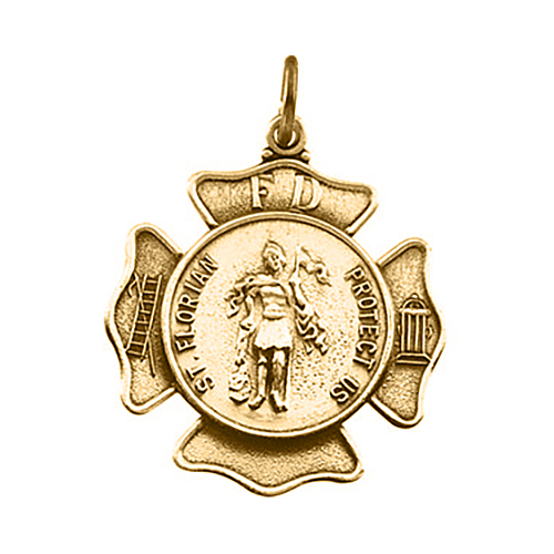 This small Saint Florian firefighter medal is made of solid polished 14k yellow gold. Size: 17mm diameter. This item is slightly smaller than a dime. Approximate weight: 1.41 grams. St. Florian is the very popular patron saint of firefighters. Bail size: 2x2.5mm. We recommend a chain no wider than 1.75mm.