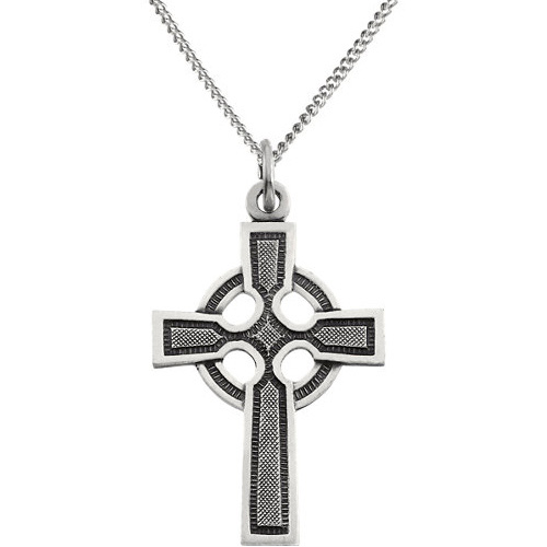 This men's solid sterling silver Celtic cross pendant includes a 24-inch sterling silver curb chain. Pendant dimensions: 28mm by 20mm. Approximate Weight: 7.96 grams.