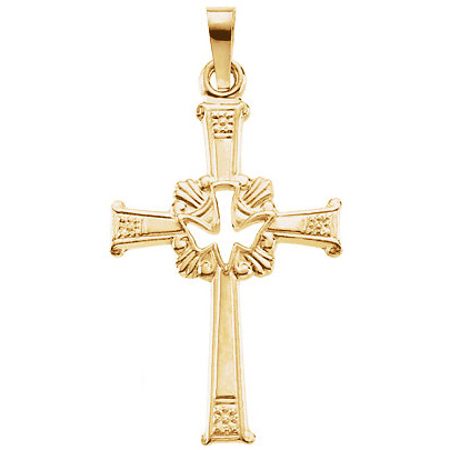 Cross with holy spirit pendant is made of polished 14kt yellow gold. Dimensions: 26mm by 18mm. Fits up to a 2.5mm wide chain. Approximate weight: 1.32 grams. Please note: weight is approximate, actual weight may vary. Chain not included.