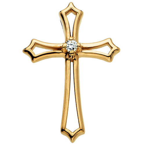 Solid 14k yellow gold cross pendant has a cut-out design and single diamond accent in the middle. Dimensions: 19mm x 13mm. This item is the height of a penny and half the width of a quarter. Diamond details: .015CT, 1.50mm full cut. Clarity: SI, color: H-I. Approximate weight: 0.79 grams.