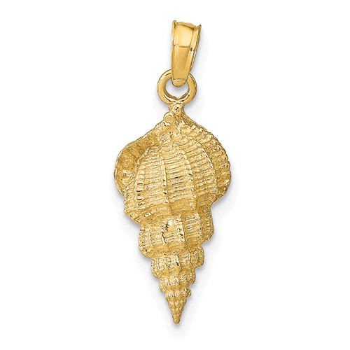 14k yellow gold conch shell pendant has a textured polished finish and open back. Pendant size: 3/8in x 5/8in without bail. Fits up to a 3.5mm wide chain. Weight: 1.2 grams. Made in Peru.