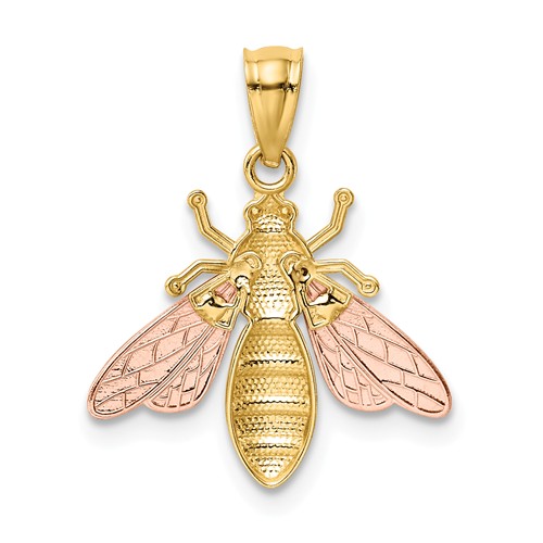 This small bee pendant is made of 14k yellow gold, 14k rose gold and rhodium. Item size: 5/8in x 1/2in without bail. Fits up to a 3mm wide chain. Weight: 0.7 grams. Made in USA.