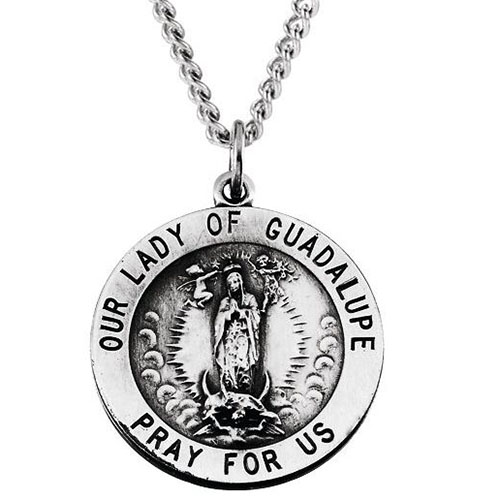 This round our lady of Guadalupe medal is made of antiqued sterling silver. Dimensions: 15mm. Sterling silver 18-inch matching chain [not pictured] Weighs 4.35 grams. Please note: weight is approximate, actual weight may vary.
