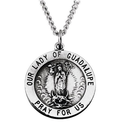 This small round our lady of Guadalupe medal is made of antiqued solid sterling silver. Dimensions: 18mm. Sterling silver 18-inch chain. Weighs 5.54 grams. Made in USA.