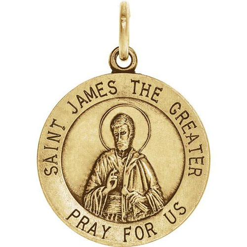Polished 14kt yellow gold medal. Engraved: SAINT JAMES THE GREATER PRAY FOR US. Dimensions: 18mm. This item is the size of a dime. Weighs 1.57 DWT (2.44 grams). Please note: weight is approximate, actual weight may vary. Chain not included. Back is blank and suitable for engraving.