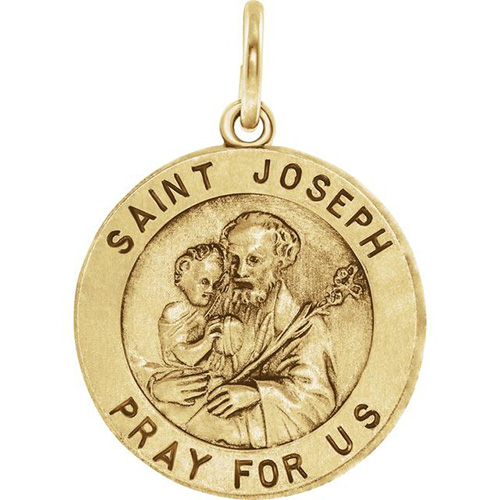 Round St Joseph medal is made of polished 14kt yellow gold. Dimensions: 18mm; this item is the size of a dime. Engraved: SAINT JOSEPH PRAY FOR US. Weighs 2.13 grams. Please note: weight is approximate, actual weight may vary. Chain not included.