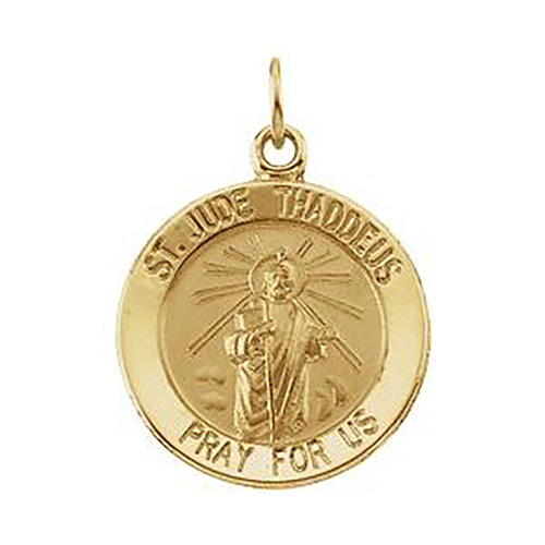 Round St Jude medal is made of polished 14kt yellow gold. Dimensions: 15mm. This item is slightly smaller than a dime. Engraved: ST. JUDE THADDEUS PRAY FOR US. Weighs 1.43 grams. Please note: weight is approximate, actual weight may vary. Chain not included. Jump ring dimensions: 1.5mm x 2.0mm. We recommend a chain no wider than 1.0mm.
