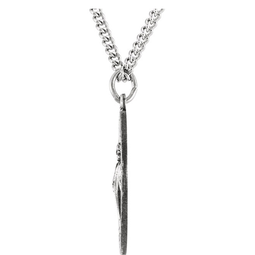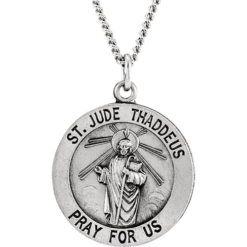 This ladies' round Saint Jude medal is made of sterling silver with antique finish. Engraved: ST. JUDE THADDEUS PRAY FOR US. Dimensions: 18.5mm. This item is the size of a dime. Weighs 2.50 grams. Please note: weight is approximate, actual weight may vary. Free 18-inch sterling silver chain.