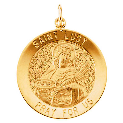 Polished 14kt yellow gold medal. Engraved: SAINT LUCY PRAY FOR US. Dimensions: 15mm. This petite medal is slightly smaller than a dime and weighs 1.49 grams. Please note: weight is approximate, actual weight may vary. Chain not included.