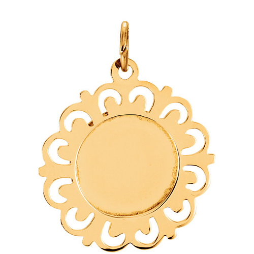This fancy St Lucy medal is made of polished solid 14k yellow gold. Engraved: SAINT LUCY PRAY FOR US. Dimensions: 18.5mm, slightly larger than a dime. Weighs 1.42 grams. Please note: weight is approximate, actual weight may vary. Chain not included.