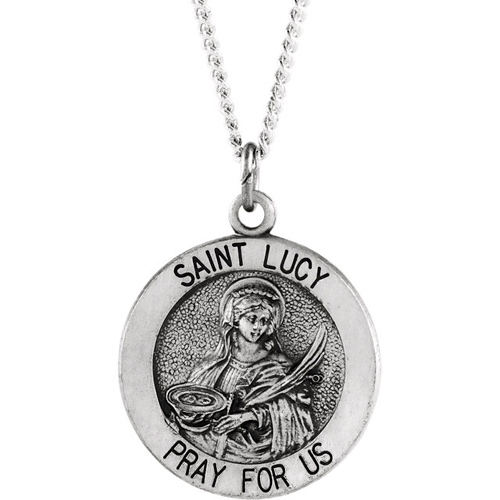 Small size is perfect for children! Polished sterling silver medal. 18-inch sterling silver chain included. Engraved: SAINT LUCY PRAY FOR US. Dimensions: 15mm diameter. Weighs 0.87 DWT (1.35 grams). Please note: weight is approximate, actual weight may vary.