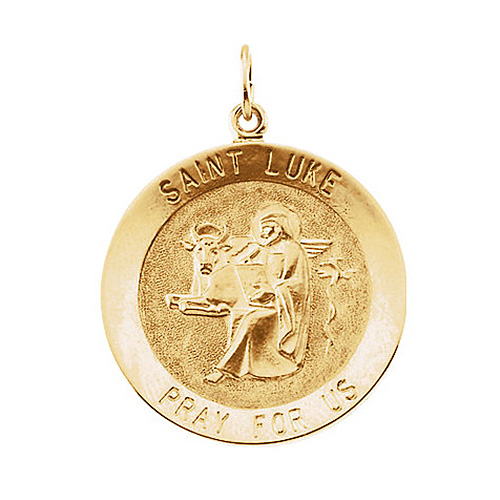 This very small solid 14k yellow gold St. Luke medal charm has a polished finish. Engraved: SAINT LUKE PRAY FOR US. Dimensions: 12mm. This item is half the size of a quarter. Weighs 0.78 grams. Please note: weight is approximate, actual weight may vary. Chain not included. Bail dimensions: 2.1mm x 2.0mm. We recommend a chain no wider than 1.5mm.