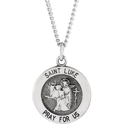 St. Luke medal is made of polished sterling silver. Engraved: SAINT LUKE PRAY FOR US. Dimensions: 22mm. This medal is the size of a nickel. 24-inch sterling silver endless curb chain. Weighs 11.97 grams. Please note: weight is approximate, actual weight may vary. Made in USA.
