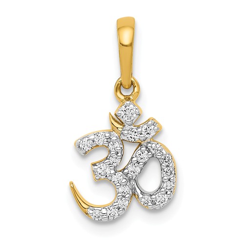 This very small 14k yellow gold om symbol diamond pendant has a polished finish. Item height: 3/8in. 21 genuine round diamonds, I2 clarity, I-J color, .15 carat total weight. Weight: 0.9 grams. Made in India.