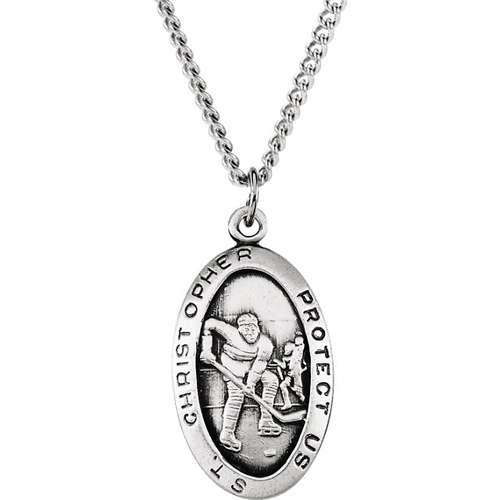 St. Christopher hockey pendant is made of antiqued sterling silver. Engraved: ST. CHRISTOPHER PROTECT US. Item size: 24.5mm x 15.5mm. 24-inch sterling silver chain and gift box. Weighs 4.11 grams. Please note: weight is approximate, actual weight may vary.