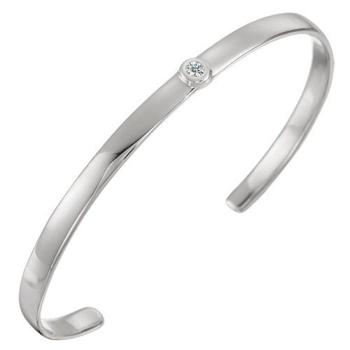 Sterling silver cuff bangle bracelet has a 1/10 carat genuine round diamond in a bezel. Diamond details: 3mm round full cut diamond, I1 clarity, G-H color. Bracelet width: 4.8mm. One size fits most women. Approximate weight: 10.6 grams. Made in USA.