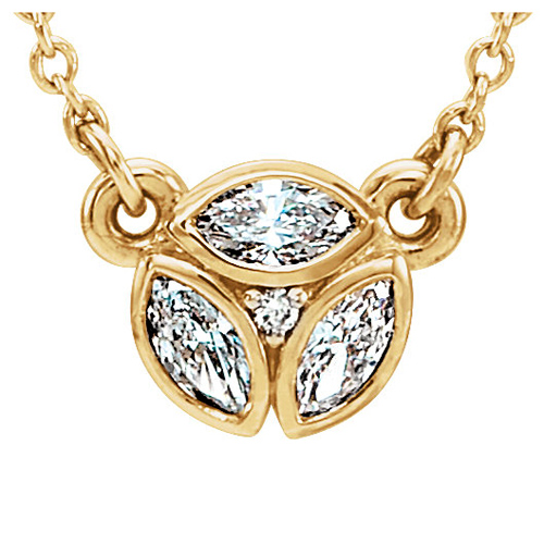 14k yellow gold 1/4 carat total weight diamond marquise-cut cluster necklace has a spring ring clasp. Adjustable 16in to 18in diamond cut cable chain is made of solid 14k yellow gold. Pendant size: 9.1mm x 6.8mm. Diamond details: three marquise cut 4mm x 2mm diamonds, one 1mm round full-cut diamond, all G-H color, I1 clarity. Approximate weight: 2.2 grams. Made in USA.