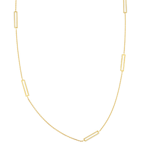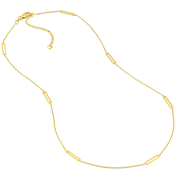 14k yellow gold open slender rectangle station necklace has a lobster clasp. Seven rectangle charms. Rectangle charm width: 3/8in. 14k yellow gold adjustable 16 to 18in diamond-cut cable chain. Weight: 2.0 grams. Import.