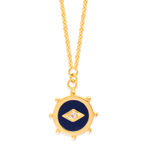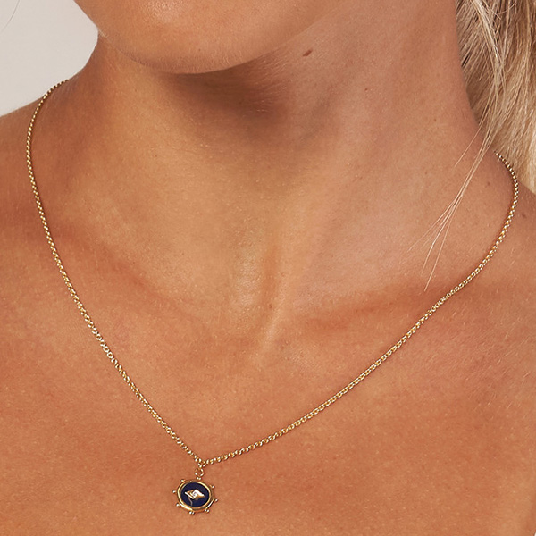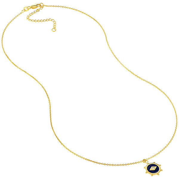 14k yellow gold ship's wheel necklace has a single diamond accent and blue enamel. Diamond details: one round full-cut diamond, I-J color and I1 clarity, .015 carat total weight. 14k yellow gold adjustable 16 to 18in diamond-cut cable chain with lobster clasp. Pendant dimensions: 3/8in x 3/8in. Weight: 3.0 grams. Import.
