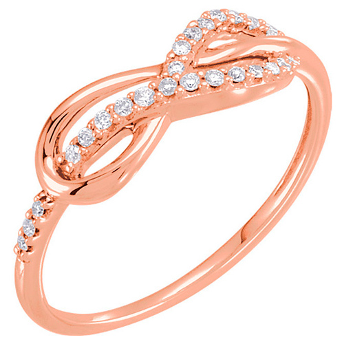 Infinity knot 1/10 ct tw diamond accent ring is made of 14k rose gold. Ring top width: 5.5mm. Standard fit. Diamond details: 24 round diamond accents, G-H color, I1 clarity. Weight: 1.4 grams. Made in the USA.