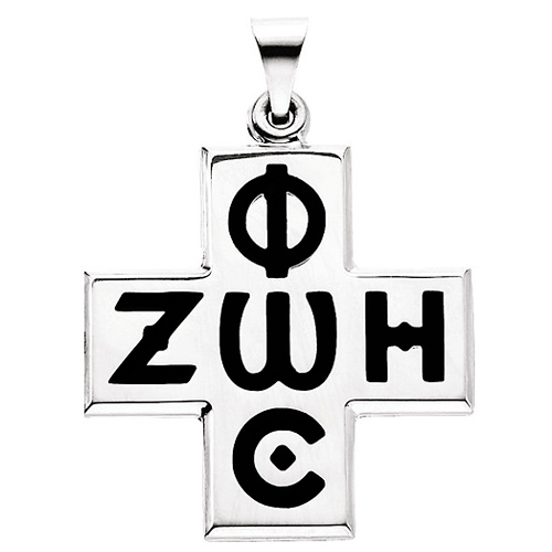Phos zoe cross pendant is made of polished 14k white gold. The Greek letters are set in a cross word design. Phos and Zoe are the Greek words for light and life. Item size: 1in x 1in without bail. Fits up to a 3mm wide chain. Approximate weight: 5.6 grams. Made in USA.