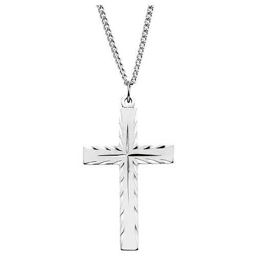 This men's fancy Latin cross pendant is made of sterling silver. Dimensions: 1in x 1 1/2in. Sterling silver 24-inch endless curb chain. This cross is larger than a half dollar and made for a man to wear. Weight: 11.9 grams. Made in USA.