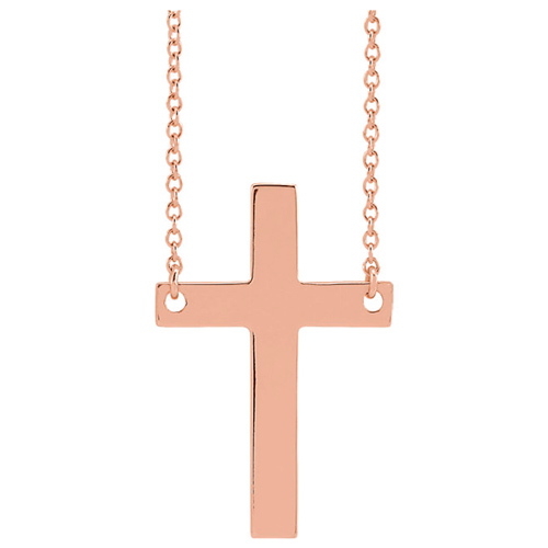 This ladies' 14k rose gold Latin cross necklace has a smooth polished finish. Pendant dimensions: 5/8in x 7/8in. 14k rose gold 18in cable chain has a spring ring clasp. Weight: 2.4 grams. Made in USA.