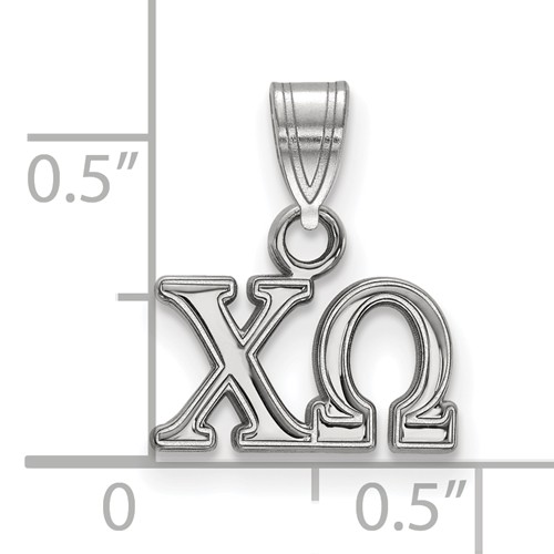 This small Chi Omega pendant is made of polished sterling silver. Item height: 5/16in, width 1/2in. Weight: 0.8 grams. Made in the USA. Fits up to a 3mm chain. Officially licensed jewelry.