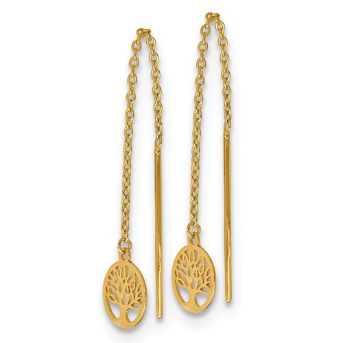 14k yellow gold tree of life threader earrings have a polished finish. Earring length: 2 3/4in. Charm size: 8mm. Weight: 0.8 grams. Made in Turkey.