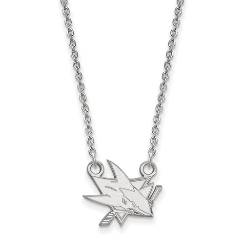This small San Jose Sharks pendant necklace is made of polished 14k white gold. Pendant height: 1/2in, width: 1/2in. Chain length: 18in. Officially licensed jewelry. Weight: 1.1 grams. Made in the USA.
