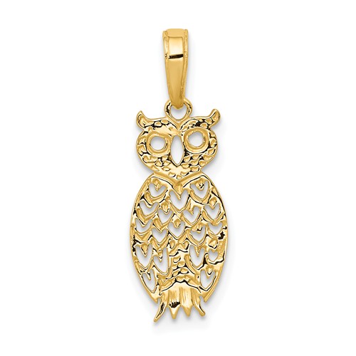 14k yellow gold owl pendant has a polished and textured finish. Flat back. Item size: 3/8in x 3/4in without jump ring. Fits up to a 3.5mm wide chain. Weight: 0.7 grams. Made in Peru. Ships from USA.