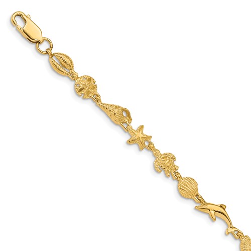 14k yellow gold sea life bracelet has a lobster clasp. Bracelet width: 7mm, length: 7.25in. Dolphin, turtle, sand dollar and starfish charms. Weight: 5.1 grams. Made in Peru.