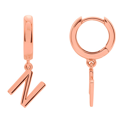 Single 14k rose gold mini letter N hoop earring has a polished finish. Earring height: 3/4in. Letter height: 3/8in. Weight: 1.2 grams. Made in USA.