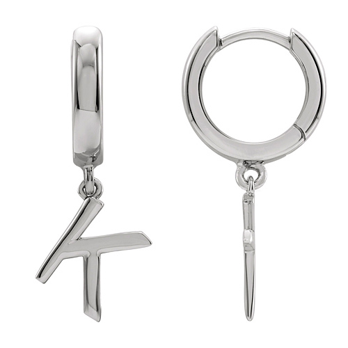 Single 14k white gold mini letter K hoop earring has a polished finish. Earring height: 3/4in. Letter height: 3/8in. Weight: 1.2 grams. Made in USA.