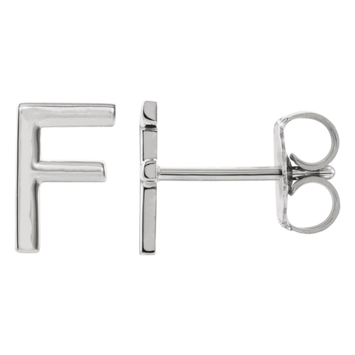Single 14k white gold mini initial F earring has a polished finish. initial height: 8mm. Friction back. Weight: 0.3 grams. Made in USA.