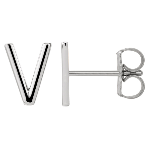 Single 14k white gold mini initial V earring has a polished finish. initial height: 8mm. Friction back. Weight: 0.3 grams. Made in USA.