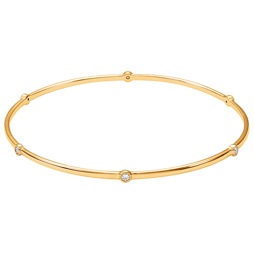 Solid 14k yellow gold diamond bezel station bangle bracelet has a polished finish. Bracelet length: 8 inches. One size fits most women. Diamond details: six round full-cut diamonds, I1 clarity, H color, .24 carat total weight. Bracelet width: 2.5mm. Approximate weight: 6.9 grams. Import.