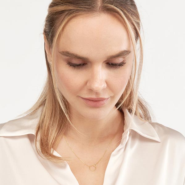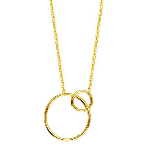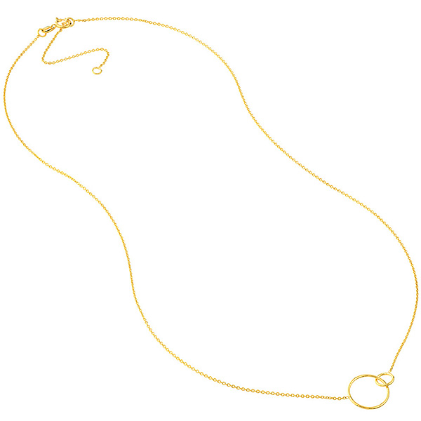 This solid 14k yellow gold interlocking rings necklace has a polished finish. The larger circle is 5/8in in diameter, slightly smaller than a dime. 14k yellow gold adjustable 16 to 18in cable chain has a spring ring clasp. Weight: 1.4 grams. Part of the Hawley Street collection. Made in Turkey. Ships from USA.