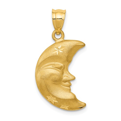 Man in the moon pendant is made of solid 14k yellow gold. Diamond-cut accents and satin finish. Item height: 3/4in without bail. Fits up to a 3.5mm wide chain. Weight: 2.1 grams. Made in USA.