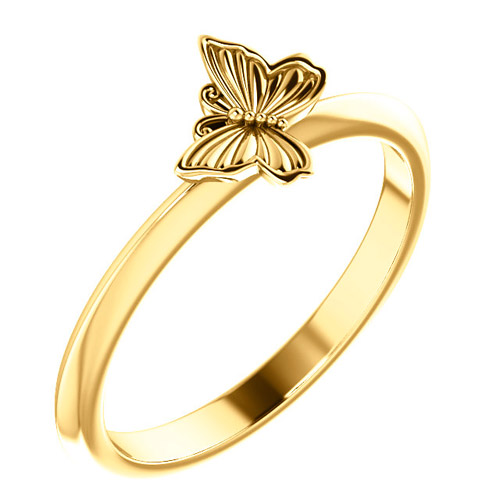 This stackable 14k yellow gold butterfly ring has a polished finish. Butterfly size: 7.8mm x 7.9mm. Ring width: 2.5mm. Size 7 approximate weight: 2.7 grams. Made in USA.
