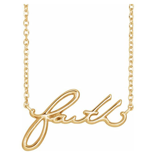 This ladies' 14k yellow gold faith necklace has a polished finish. Pendant size: 7/8in x 1/2in. 14k white gold 18 inch diamond-cut cable chain has a spring ring clasp. Chain width: 1mm. Weight: 2.3 grams. Made in USA.