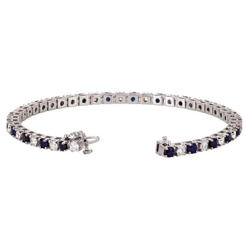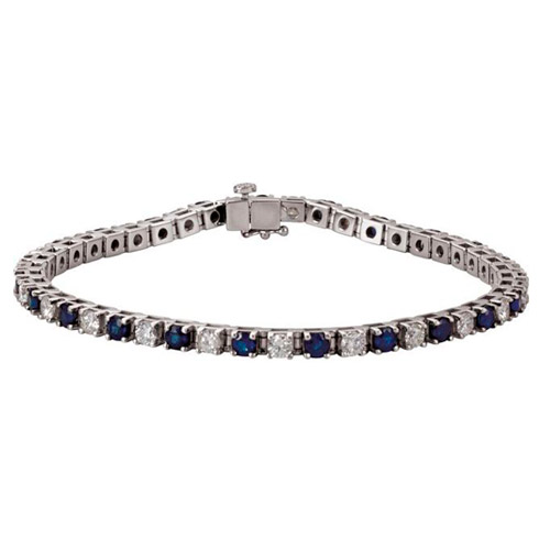 14k white gold genuine blue sapphire bracelet has 2.37 ct tw diamond accents. 23 genuine 3mm round blue sapphires, A quality. 23 genuine 3mm round full cut diamonds, G-H color, I1 clarity. Tongue clasp. Bracelet length: 7in. Rhodium-plated. Weight: 13.0 grams. Import.