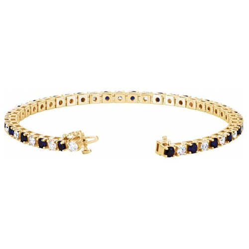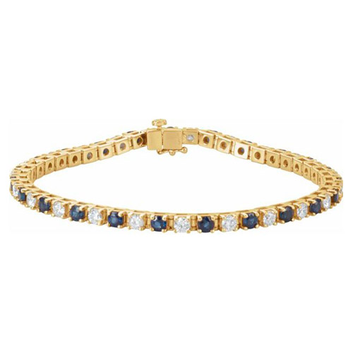 14k yellow gold genuine blue sapphire bracelet has 2.37 ct tw diamond accents. 23 genuine 3mm round blue sapphires, A quality. 23 genuine 3mm round full cut diamonds, G-H color, I1 clarity. Tongue clasp. Bracelet length: 7in. Rhodium-plated. Weight: 13.0 grams. Import.