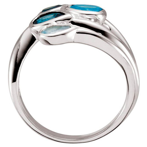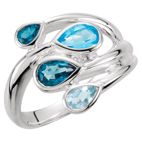 Sterling silver bypass ring has pear shaped London blue topaz, sky blue topaz, and Swiss blue topaz gemstones. medal ring has a polished finish. Top dimensions: 3/8in x 5/8in. Ring width: 2.2mm. Size 7 approximate weight: 4.2 grams. Standard fit. Made in USA.
