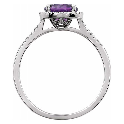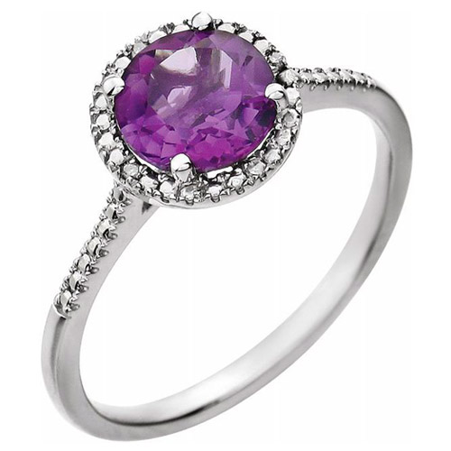 Amethyst and diamond halo ring is made of sterling silver. Genuine 7mm round amethyst and four diamond accents. Diamond quality: I1 clarity, I-J color, .01 carat total weight. Top width: 9.7mm. Average item weight: 1.8 grams. Please note: weight is approximate, actual weight may vary. Made in the USA.
