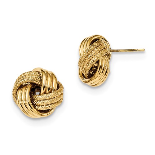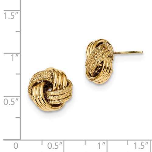 14k yellow gold three strand love knot earrings have a textured and polished finish. 3-dimensional. Earring size: 1/2in x 1/2in. Hollow. Weight: 1.6 grams. Made in Italy. Ships from USA.