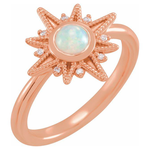 14k rose gold Ethiopian opal and diamond ring has a celestial inspired design. 5mm round cabochon white Ethiopan opal is bezel set. Diamond details: eight 1mm round diamonds, .03 carat total weight, I1 clarity, G-H color. Ring top dimensions: 15.1 mm x 15.1mm. Size 7 approximate weight: 4.1 grams.