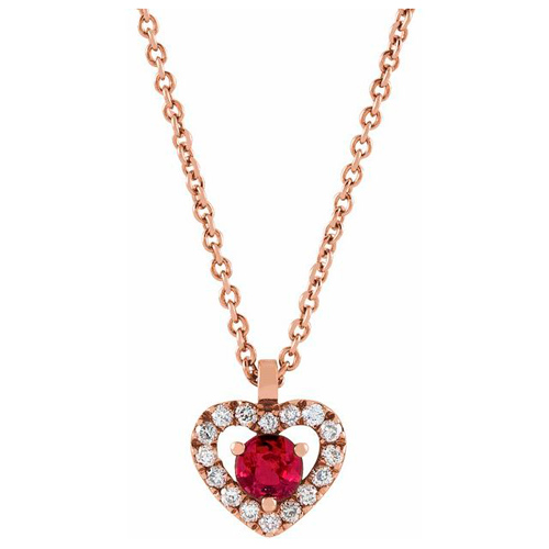 14k rose gold .16 ct ruby heart necklace has .06 ct tw diamond accents. Heart pendant size: 6.8mm x 6mm. 3mm round genuine ruby, A quality, .16 carat. 16 round single cut diamonds, I1 clarity, H-I color. 14k rose gold cable chain has a spring ring clasp. Weight: 1.4 grams. Made in the USA.